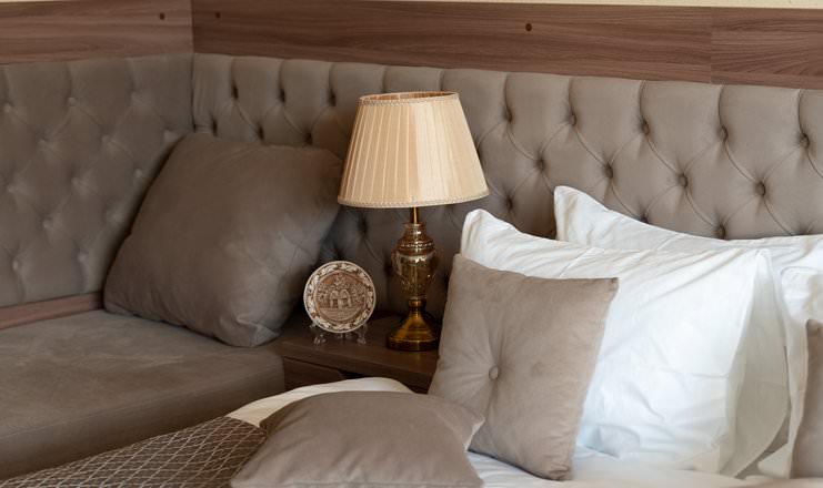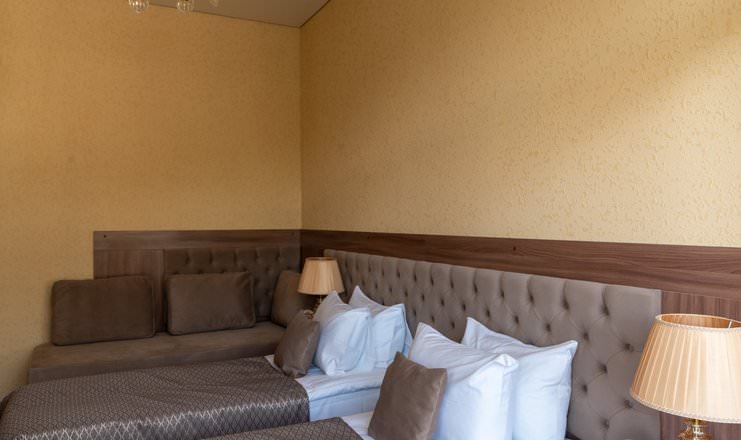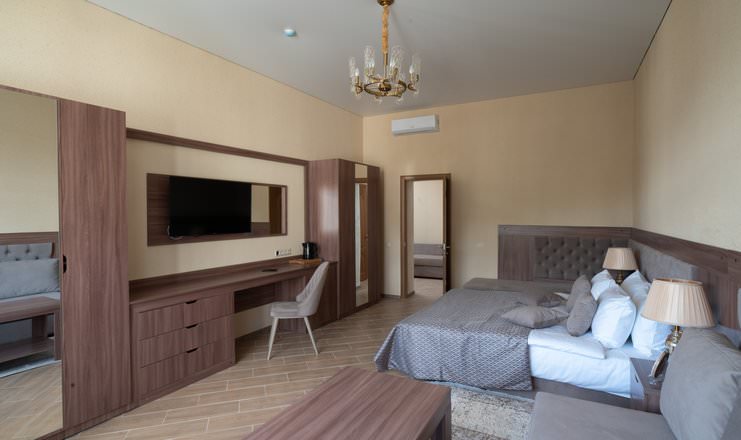 Уникальный двухкомнатный номер включает в себя светлую спальню и роскошную гостиную. Это настоящее переплетение функциональности и эстетики. Дизайнерская мебель удобна и многофункциональна. В интерьере доминируют фактуры с натуральными расцветками.